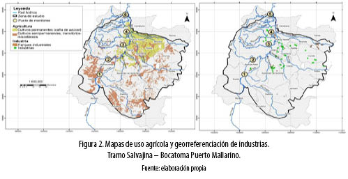 Se realizaron dos muestreos de calidad del agua (temporada lluviosa y de pocas lluvias), y se monitorearon los peligros químicos identificados en la matriz de priorización. Dado que los mapas de uso agrícola y georreferenciación de industrias elaborados (Figura 2) evidencian agricultura intensiva y como cultivo predominante la caña de azúcar y que la concentración del sector industrial y el mayor deterioro de la calidad del agua ocurren a partir de la estación 3 (La Bolsa), los sedimentos se caracterizaron solo en las estaciones Hormiguero y Bocatoma, ya que estas características indican una mayor probabilidad de encontrar sedimentos impactados por sustancias químicas a partir de la estación de Hormiguero. Basados en los resultados de la matriz de priorización de peligros químicos, en los sedimentos, se caracterizaron los metales pesados que se presentaron en más de 100 UP y que excedieran los valores de referencia para el uso de la fuente para consumo humano, previo tratamiento.