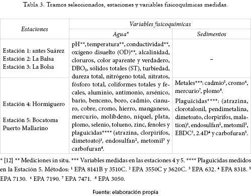 La tabla 3 detalla los tramos evaluados, las estaciones y las variables fisicoquímicas medidas en agua y sedimentos. Se incluyeron algunas variables microbiológicas y fisicoquímicas adicionales con el objetivo de calcular los índices de calidad (ICA) y de contaminación (ICOMO) [15,16]. Los resultados de la caracterización del agua y los sedimentos en términos de metales y plaguicidas fueron contrastados con la normativa nacional e internacional, y clasificados según la calidad de acuerdo con CETESB [17], identificando así los potenciales riesgos en la cuenca.