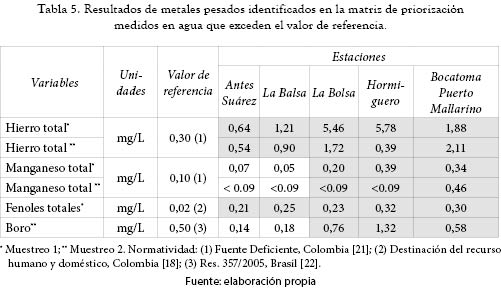 En general, los metales identificados en la matriz de priorización (tabla 4) caracterizados en agua presentaron valores por debajo de los límites de detección que son inferiores a los criterios de calidad admisibles establecidos en la normativa para el uso de la fuente para consumo humano previo tratamiento; sin embargo, algunos metales pesados excedieron valores de referencia como se muestra en la tabla 5.
