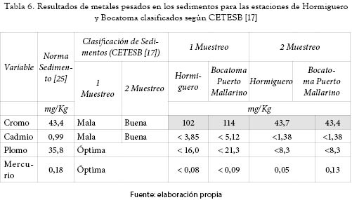 Las posibles fuentes de estos metales pesados pueden ser el sector industrial que utiliza estos compuestos, las descargas del canal sur aportados por el drenaje sur de la ciudad de Cali, los lixiviados que genera el botadero de Navarro, la actividad agrícola debido a que los suelos en la parte plana del valle del río Cauca (a partir de la estación de monitoreo La Bolsa) presentan bajos niveles de manganeso (23 %), lo que requiere el uso de fertilizantes que aporten este componente y la fuente natural de los suelos [23,24]. La tabla 6 presenta los resultados de metales pesados en sedimentos sombreando aquellos que exceden el valor de referencia internacional ''Freshwater Sediment Screening Benchmarks'' [25] y clasificando su calidad de acuerdo con CETESB [17].