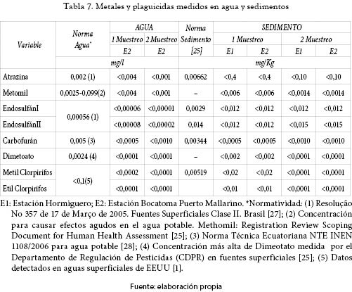 La tabla 7 muestra los resultados medidos en agua y sedimentos para plaguicidas, comparándolos con la normativa internacional.