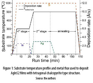 The elemental evaporated metal flux and the substrate temperature profile that allowed us to grow AgInS2 films with chalcopyrite structure and good optical and structural properties are shown in Figure 1.