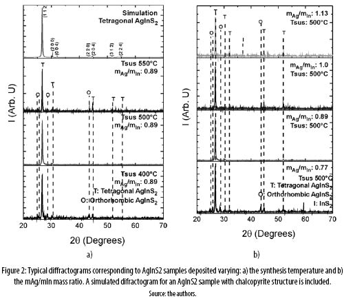 Figure 2 displays typical diffractograms of AgInS2 thin films grown varying the substrate temperature between 400°C and 550°C and the mAg/mIn ratio between 0.77 and 1.13. The experimental diffractograms are compared with a simulated diffractogram obtained using the PowderCell software, which uses a procedure based on the method of Rietveld refinement [9]. From the data reported by ICDD (International Center for Diffraction Data) data base and information obtained from the simulation, we were able to identify the phases present in the samples with a good degree of reliability.