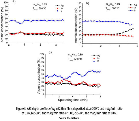 The AES measurements revealed that in general the chemical composition and the homogeneity of the atomic concentration in the bulk of the AgInS2 films are affected by both, the growth temperature and the mAg/mIn ratio. However, we have found that samples prepared at temperatures around 500°C using mAg/mIn ratios near 0.89, grow with chemical composition close to the stoichiometric composition, being their atomic concentration homogeneous in the whole volume (see figure 3a). It was also found that the AIS films prepared at 500°C but using a mAg/mIn ratio of 1.00 present homogeneous chemical composition in most of the bulk; however, in the region close to the substrate the sample becomes Ag-rich and S-poor because in this region may be favoring the formation of sulfide Ag 1+ or 3+ (see fiigure 3b). On the other hand, the AES analysis carried out on samples prepared at temperatures greater than 500°C (keeping mAg/mIn = 0.89), indicated that this type of samples are inhomogeneous in chemical composition (see figure 3c). This behavior could be attributed to the formation of secondary phases like InS2, identified through XRD measurements.