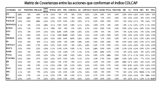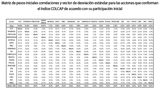 De acuerdo con los pesos iniciales de los activos que conforman el portafolio del índice, se obtienen la matriz de correlaciones iniciales, el vector de desviaciones estándar iniciales y la matriz de covarianzas iniciales, las cuales se presentan en el Anexo A.