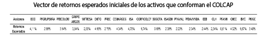 Una vez se identifica la estructura de portafolio del índice COLCAP se procede a optimizarlo mediante el modelo BL (paso 2) con base en las expectativas sobre algunos de los activos que lo conforman. En el COLCAP el peso de cada acción se obtiene como el cociente entre el ponderador de cada acción multiplicado por su precio en el periodo t y dividiendo por la sumatoria de los productos entre los ponderadores y los precios de cada acción en el mismo período. Con la información de rendimientos histórico de las acciones del COLCAP se construirán el vector de rendimientos iniciales y las matrices de correlación y de covarianzas necesarios para aplicar el modelo BL (ecuaciones (16 – 18)). Una vez obtenidos los pesos y rendimientos posteriores a partir del modelo BL, se utilizarán estos resultados para estructurar un portafolio eficiente mediante la propuesta de Markowitz, el cual considerará las expectativas incorporadas dentro del modelo BL (paso 3).