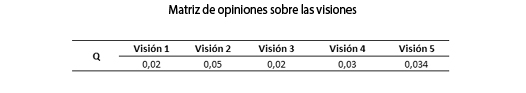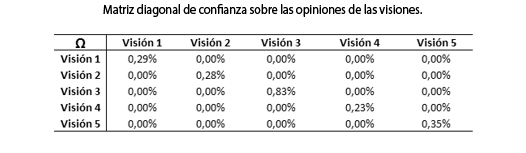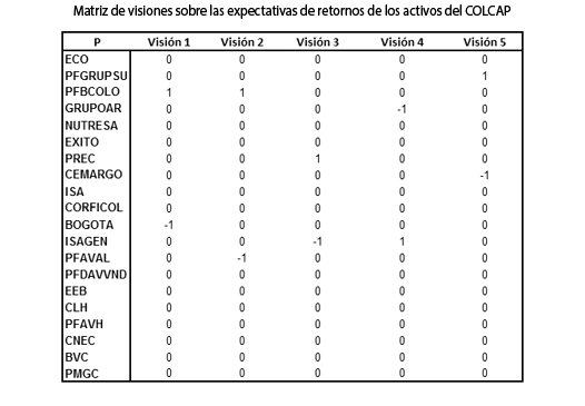 Una vez obtenidas las matrices anteriores, es posible desarrollar la propuesta metodológica del modelo BL. Para determinar el coeficiente δ se asume como rendimiento esperado libre de riesgo la DTF, expresada en términos nominales diarios. La asignación de expectativas sobre cada uno de los activos se hace en términos de la expectativa de que un activo supere el retorno de otro activo referencia (las cuales se expresan en la matriz P). Dichas visiones consideran las opiniones presentadas en la matriz Q, que para este caso precisa definir cinco visiones y cinco opiniones de excesos de retorno. Por ejemplo, en las matrices P y Q se observa que en la visión 1 (matriz P) se tiene la expectativa que la especie Preferencial Bancolombia (PFBCOLOM) supere a Banco de Bogotá (BOGOTÁ), con un exceso de retorno de 2 %. Con base en la matrices de visiones P y la matriz de covarianzas iniciales se estima la matriz de confianza en las opiniones (Ω), la cual se presenta junto con las matrices P y Q en el Anexo A.