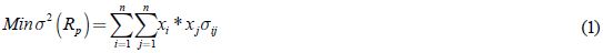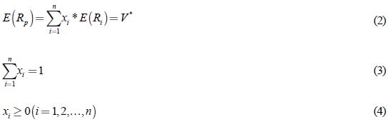 es la varianza del portafolio p, y σij, la covarianza entre los rendimientos de los activos financieros i y j; E(Rpij), es la rentabilidad del portafolio p, de tal forma que al variar el parámetro V* obtendremos en cada caso el conjunto de proporciones xi que minimizan el riesgo de la cartera, así como su valor correspondiente. El conjunto de pares