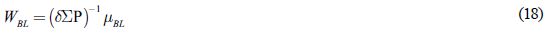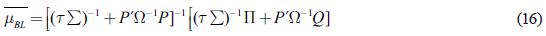 Donde r es el vector de los rendimientos de los activos. Si se asume que todos los inversionistas tienen la cartera de mercado Weq, y en donde las primas de riesgo de equilibrio Π son tales que si todos los inversionistas tienen el mismo punto de vista, la demanda de estos activos es exactamente igual a la oferta [7]. Suponiendo que la tolerancia al riesgo es representado por el parámetro de aversión al riesgo δ, las primas de riesgo de equilibrio se estiman como: