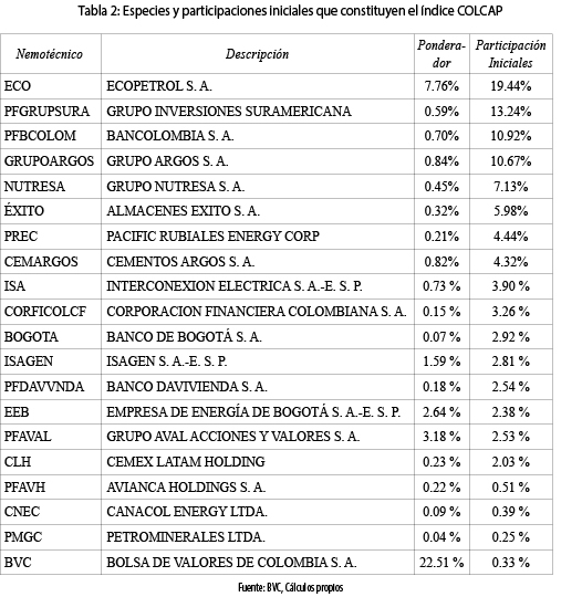 Como primer paso se identifica la estructura del portafolio inicial, que se determina asumiendo los ponderadores y participaciones iniciales de cada uno de los activos que conforman el índice COLCAP, el cual se analiza con base en datos históricos desde el 2 de enero de 2013 hasta el 30 de agosto de 2013. Las acciones, los ponderadores y la participación inicial se presentan en la tabla 2.