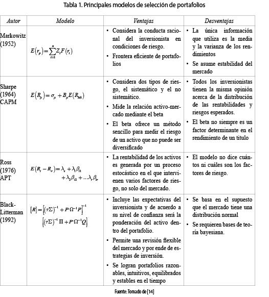 Con relación a aplicaciones en Latinoamérica, Cruz, Urrutia y Medina [12] desarrollan un modelo dual que permite maximizar la rentabilidad y minimizar la inversión inicial requerida, mientras que Cruz y Clement [13], con relación a la apertura de la inversión hacia mercados globales, afirman que uno de los riesgos que debe tener en cuenta el inversionista al incursionar en dichos mercados es el riesgo cambiario, dado que el rendimiento no solo dependerá de la variación en precios del activo a invertir, sino también de la evolución de la moneda en su tasa cambiaria, por lo cual se hace necesario hacer un estudio que permita administrar de manera eficiente estos riesgos recomendando el uso del modelo BL para la administración de los riesgos de los portafolios internacionales o globales. Las características de las cuatro principales propuestas teóricas para la estructuración de portafolios se resumen en la tabla 1.