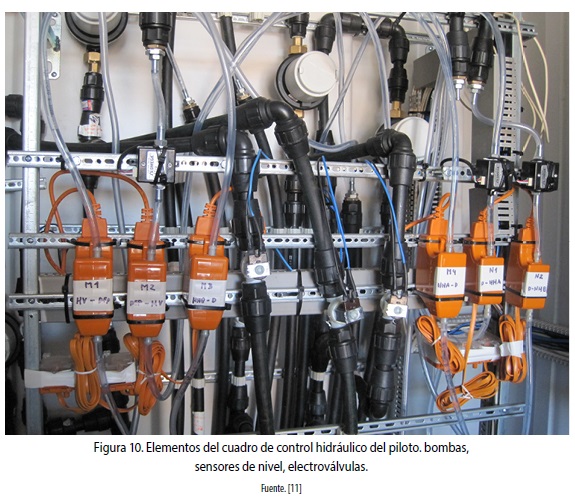 A su vez, en cada una de las zonas mostradas en la figura 8, puede visualizarse cada elemento vinculado a ella, como son los sensores de nivel, bombas, electroválvulas, contadores de consumo, filtros y caudalímetros de las figuras 9 y 10. Las figuras 11 a 12 muestran todos estos elementos, los cuales están controlados por un kit de automatización que consta de computadora, ruteador, módulos de control, potencia y distintos sensores.