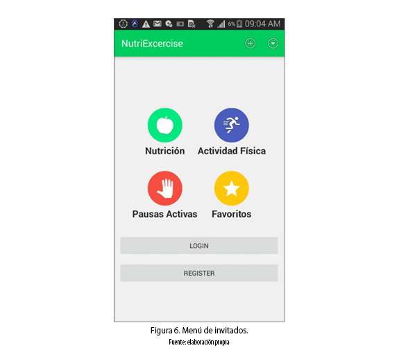 Menú de invitado (figura 6): para visualizar este menú no necesita estar registrado; por lo tanto, las recomendaciones son generales y no basadas en datos personales; fue diseñado con el propósito de que los usuarios hagan un recorrido por la aplicación y puedan hacer uso de la misma de una forma básica. En esta primera configuración el usuario puede ver contenidos multimedia de actividad física, nutrición saludable y pausas activas, y guardarlas en favoritos.