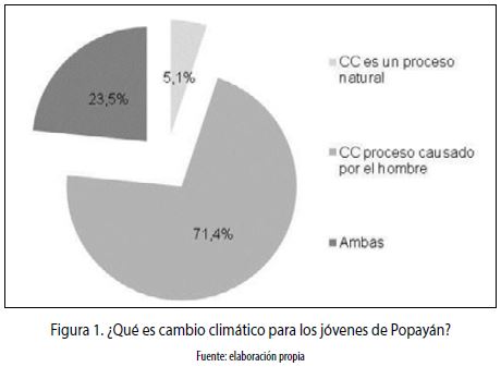 ''La inconsciencia del hombre frente a la destrucción del mundo'' (hombre, 23 años), ''cambios bruscos de temperatura'' (hombre, 29 años), ''nosotros somos los responsables del cambio climático'' (mujer, 24 años), ''es una serie de fenómenos naturales que suceden en el planeta, algo fuera de lo normal'' (mujer, 18 años), son algunas de las frases mencionadas espontáneamente por los jóvenes de la zona urbana de la ciudad de Popayán durante la presente investigación, al preguntarles qué es para ellos el CC.