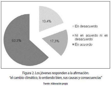 Al indagar si los jóvenes de la ciudad estaban de acuerdo con la frase ''el cambio climático, lo entiendo bien, sus causas y consecuencias'', el 63 % respondió estar de acuerdo y el 19 % manifestó estar en desacuerdo (figura 2).