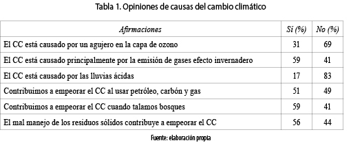 Para evaluar sobre cuáles serían las causas del CC y las acciones que contribuyen a causarlo, se plantearon interrogantes en donde los jóvenes debían responder de forma afirmativa o negativa a cada oración (tabla 1). Para el 59 % de los encuestados ''el CC está causado principalmente por la emisión de gases efecto invernadero''. En la afirmaciones ''el CC está causado por el agujero en la capa de ozono'' y el ''CC está causado por las lluvias ácidas'', se encontró que el 31 % y el 17 %, respectivamente, de los entrevistados las considera ciertas, siendo que el agujero en la capa de ozono y las lluvias ácidas no son causas determinantes del CC.