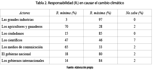 En otra pregunta se indagó acerca de las responsabilidades que tienen diferentes actores sociales e institucionales en causar el CC. Los encuestados indicaron que las grandes industrias tienen la responsabilidad máxima en causarlo con el 97 %; seguido de los ciudadanos con 85 %, y los gobiernos internacionales 84 % (tabla 2). Actividades como la ganadería y la agricultura que tienen un gran aporte al CC no son consideradas por los jóvenes como una causa.