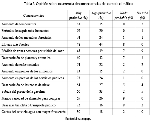 En relación con las causas del CC, se preguntó a los jóvenes acerca de la probabilidad de que algunas consecuencias del CC ocurriesen en los próximos 10 años en Colombia. Para 8 de cada 10 entrevistados, las consecuencias más probables son: aumento en la temperatura y aumento en los precios de los alimentos (tabla 3); para 7 de cada 10 las consecuencias con mayor probabilidad de ocurrir son: períodos de sequía más frecuentemente, aumento de los incendios forestales, aumento de enfermedades, aumento en los precios de los servicios públicos, tendrán que usar más la bicicleta o el transporte público, y que habrá cortes del servicio de agua con mayor frecuencia.