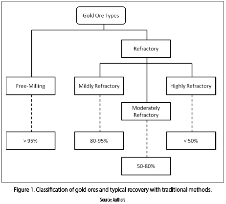 The literature already shows that microwave heating can be used as an alternative to process some mineral ores (e.g. gold and iron) [ 4– 9] , since traditional processing face different problems. One of the most important is that there exists different kind of samples. Figure 1 shows a general classification, considering how easy it is to recover the mineral, as well as their expected recovery rates. It can be seen that processing of refractory gold ores can yield low rates, so they require implementation of extra stages, such as roasting, in order to eliminate the compounds that cause the refractoriness (e.g. sulfur–based compounds or carbon,), or grinding, in order to free smaller particles of gold that are trapped inside other elements or inside the gangue.