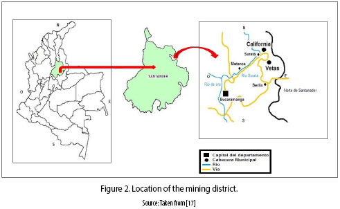 Focusing on a more local context, it is known that Santander has a couple mining districts worth mentioning, which are California and Vetas, but since the sample used during this research comes from the latter, the former is not discussed. Figure 2 shows the location of the mining zone, which has an area of 139 km2 and a population of 4153. The ore extracted from Vetas has low–sulfidation, normally presenting pyrite composition below 5 %. The predominant metals are gold and silver, the latter being accompanied by zinc, lead or copper. This ore may also contain Mo, Sb, As(Te, Se, Hg), according to the study carried out by [ 17] .