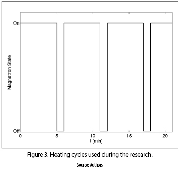 A prior analysis was performed to try and find all the possible factors that can affect microwave roasting and, thus, gold recovery, which are summarized in Table 1. Factors believed to affect microwave roasting. With it, it was defined that during this research, a factorial experiment was going to be used. Three factors were chosen, with two levels per factor (see table 2), and three repetitions, so a total of 24 experiments were carried out in random order (so the experiment is unbiased). These levels were chosen because of different reasons. In the case of time, it was found that exposure under 25 minutes didn't roast the sample, whilst values over 40 led to sintering of the ore. Moreover, it was necessary to define some heating cycles, because oxygen is needed for roasting, and temperature needs to be homogenized. During this research, the exposure was split into stages of five minutes, allowing mixing and oxygenation during one minute, as shown in figure 3.