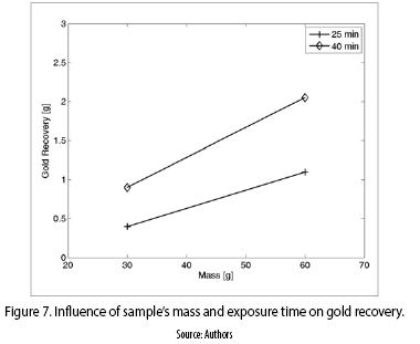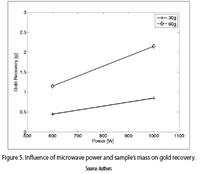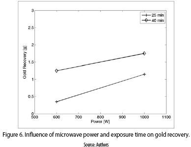 On the other hand, figure 6 shows the influence of output power and exposure time, over gold recovery. Again, and according once more to logic, the highest exposure time, at the highest microwave power, yielded the highest recovery.
