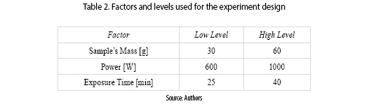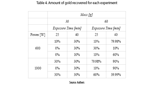 For the mineral's mass, 30 g was set as the lower level because it represents the amount of mineral that is required for traditional smelting at lab scale. The maximum was defined as its double (i.e. 60 g). Finally, the lower level of microwave power was defined at 60 % in order to use a value quite different from its maximum power (i.e. 100 %), but which will not increase the exposure time extensively. It is important to remark that the power was set using the microwave oven internal controller (i.e. the oven was configured via the front panel and keypad). The output variable was defined as the percentage of gold that can be recovered, after microwave roasting, with a traditional lab scale smelting.