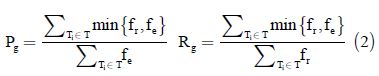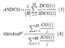 Equations 3 and 4, presents the ANDCG and GenAveP' measures where CG is the cumulated gain, ICG(i) is the ideal CG, DCG is the discounted CG, IDCG is the ideal DCG. The
