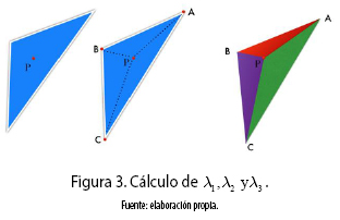 de vértices A(Xa, ya), B(xb, yb), C(xc, yc), entonces cualquier punto interior del triángulo P(x,y), puede ser representado por tres coordenadas baricéntricas (λ 1, λ 2, λ 3), donde λ 1 + λ 2 + λ 3 = 1, cuyos valores deben pertenecer al rango 0 ≤ λ 1 + λ 2 + λ 3 < 1. Las tres componentes baricéntricas se obtienen de la relación de las áreas de los triángulos internos A1, A2 y A3 con el área total AT, como: λ 1 = A1/AT, λ 2 = A2/AT y λ 3 = A3/AT (figura 3(b)). Si λ 1 + λ 2 + λ 3 ≠ 1 el punto no está dentro del triángulo.