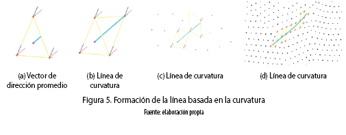 El siguiente paso consiste en calcular la nueva dirección de la línea de curvatura; para ello se requiere nuevamente el cálculo de los vectores de curvatura promedio, pero ahora se calculan con base en los puntos que componen este nuevo triángulo, el cual contiene el punto final del primer segmento de línea. Teniendo esta nueva dirección promedio, el proceso es el mismo que para el triángulo inicial: se estira el vector en dirección promedio hasta que el punto final esté fuera del triángulo (figura 5(b)); la única diferencia es que no se traslada el vector de curvatura al punto central del triángulo, sino al punto final del segmento anterior. Este proceso se repite (figuras 5(c) y 5(d)), hasta que alguno de los criterios de terminación de línea se cumpla.