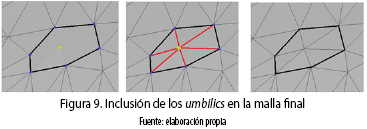 Para evitar que se pierda información relevante de la anatomía del rostro, se deben considerar los puntos donde se encuentran singularidades en la curvatura, es decir, los umbilics. Estos se incluyen en la malla poligonal y se crean caras con los vértices del polígono más cercanos (figura 9), obteniendo la malla final (figura 10).