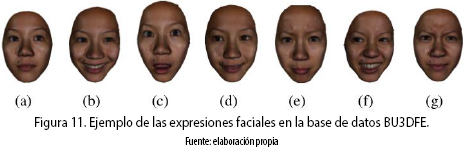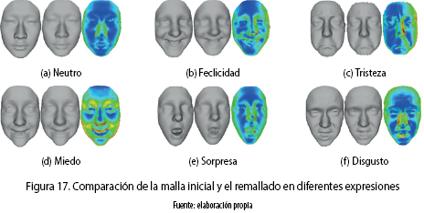Con el fin de determinar el comportamiento de la metodología de remallado en el rostro humano propuesta, se calculó el remallado en modelos neutros y modelos con expresiones, para lo cual se utilizó la base de datos BU–3DFE [15] . Esta base de datos de rostros en 3D incluye 2500 modelos de 100 sujetos (56 % femeninos, 44 % masculinos). Para cada sujeto se tienen 7 expresiones faciales: expresión neutra (figura 11(a)), felicidad (figura 11(b)), sorpresa (figura 11(c)), miedo (figura 11(d)), tristeza (figura 11(e)), disgusto (figura 11(f)) y enojo (figura 11(g)). Adicionalmente, cuenta con cuatro diferentes niveles de intensidad de cada expresión, de los cuales se utilizó el nivel máximo, donde la expresión está más definida.