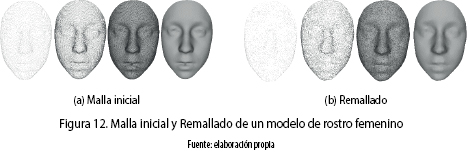 Se aplicó el algoritmo a los 80 modelos de la base de datos en expresión neutra; en promedio se logró generar una malla con el 46 % de los vértices y con el 48 % de las caras de la malla inicial. En la figura 14(a)se muestra un modelo (malla inicial) que cuenta con 7740 vértices y 15 030 caras, y el remallado final (figura 12(b)) que requiere solo 3676 vértices y 7567 caras, es decir, un 47 % de los vértices y 50% de las caras. En las figuras, de izquierda a derecha, se presenta la nube de puntos, la malla, la malla con textura gris y, finalmente, la malla suavizada.