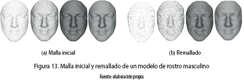 En el modelo masculino de la figura 13(a), la malla inicial cuenta con 9930 vértices y 18 241 caras; después del proceso de remallado fueron necesarios 5042 vértices y 10 160 caras (figura 13(b)), es decir, un 51 % de los vértices y un 56 % de las caras.