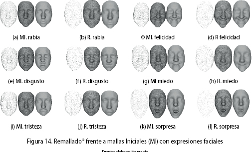 Se calculó el remallado para 80 rostros: 40 mujeres y 40 hombres. En promedio se logró generar una malla con el 46 % de los vértices y con 47 % de las caras, de la malla inicial. La desviación estándar del número de vértices y caras fue del 4.2 y 4.8, respectivamente. En la figura 14 se muestra el resultado del remallado (R) comparado con la malla inicial (MI), para cada una de las expresiones faciales.
