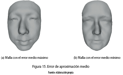 En la tabla 1, se muestra el error de aproximación medio promedio, para cada grupo de modelos con la misma expresión. Se evidencia que la expresión de miedo presenta un menor error; y que el error de aproximación al modelo inicial es similar sin importar la expresión facial del modelo.