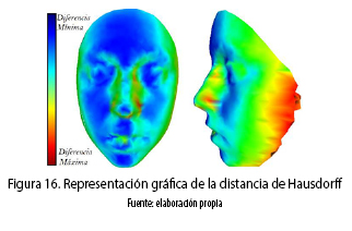 Con el fin de mejorar la interpretación de los resultados, se presenta la métrica de Hausdorff de forma gráfica, comparando la malla inicial con el remallado (figura 16). Se representó la diferencia entre las mallas por medio del color; en rojo se muestran los puntos de máxima diferencia, y en azul, los puntos con mínima diferencia; a los valores intermedios se les asignó un degradé que pasa por naranja, amarillo y verde.