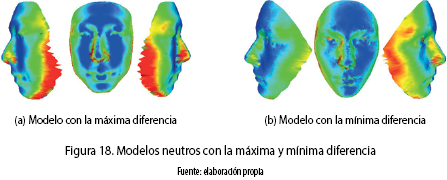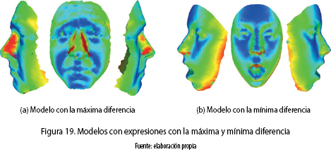 Para los modelos con expresión, la máxima diferencia se muestra en la figura 19(a)y corresponde a la expresión de tristeza. En cuanto al modelo con la mínima diferencia, se ilustra en la figura 19(b) y corresponde a la expresión de sorpresa. En general, las zonas que presentan la mayor diferencia son los extremos de la malla; esto debido a que la zona cambia de acuerdo a la segmentación del rostro, realizada manualmente durante la adquisición de la base de datos. Dicha zona, en general, no es relevante, ya que no aporta información del rostro o de la expresión.