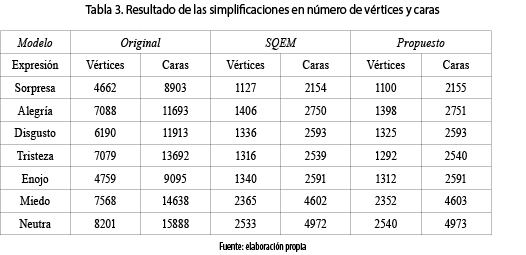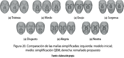 La reducción, en el método de simplificación basado en QEM solo se puede garantizar en el número de caras, puesto que los vértices resultantes son dependientes de las caras formadas. En este punto se ve la primera diferencia entre los dos métodos, el número de vértices es menor para el método de remallado propuesto, debido a que se utilizan polígonos para la formación de las caras y, en consecuencia, se requieren menos vértices para la simplificación. En la figura 20 se muestran los resultados de la simplificación para diferentes modelos con expresiones faciales.