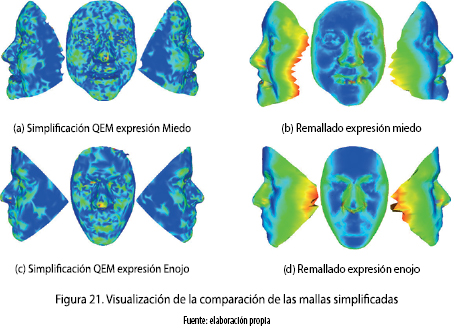 La figura 17 ilustra los resultados de comparación en las diferentes expresiones faciales. En cada caso se muestran la malla inicial, el remallado y la diferencia basada en la métrica de Hausdorff, respectivamente.