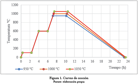 La humedad óptima para la preparación de la pasta cerámica fue establecida en un 19 %, producto de los resultados obtenidos en el ensayo de humedad óptima de compactación. Las materias primas (Ar –B) fueron sometidas a un proceso de molienda o reducción de tamaño; seleccionando partículas entre 70 μm – 1 mm (material que pasa tamices N.° 18-N.° 200). La dosificación de los materiales en las mezclas se realizó en peso. Los elementos cerámicos fueron conformados con dimensiones: longitud 100 mm, ancho 50 mm, alto 50 mm; según NTC 296 (dimensiones modulares de ladrillos cerámicos). Para el secado, los elementos cerámicos en verde se dejaron a temperatura ambiente, 60 °C y 105 °C durante 12 h, con el fin de asegurar un secado adecuado. El proceso de cocción se hizo en un horno mufla de laboratorio, cuya curva de cocción se muestra en la figura 1, compuesta por 3 rampas de temperatura con una tasa de incremento de 5 °C*min–1 cada una.