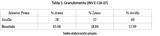 El contenido de arenas, limos y arcillas (obtenido del ensayo de granulometría por hidrómetro) para las materias primas arcilla y biosólido se puede ver en la tabla 3.