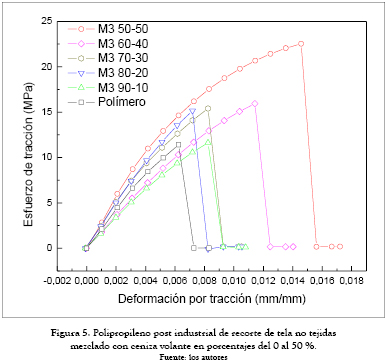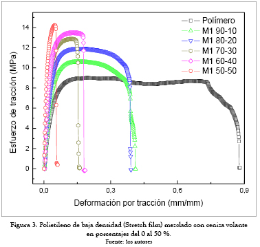 Los ensayos de tracción se hicieron a probetas con diferentes porcentajes de contenido de cenizas volantes (0, 10, 20, 30, 40, y 50 % en peso) y polímeros tales como: polietileno de baja densidad (PEBD) denominado M1; polietileno de baja densidad lineal (PEBDL) reciclado de los empaque de bolsas de leche, denominados M2 y polipropileno pos–industrial de recorte de tela no tejidas, denominado M3.