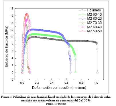 En la figura 4 se muestra el comportamiento del polietileno de baja densidad lineal (PEBDL), el cual, al igual que el polietileno de baja densidad (figura 3), aumenta la resistencia a la tensión en un 71 % y disminuye el módulo elástico en un 54 %; el PEBDL presenta mejor resistencia a la tracción y mejor elongación que el PEBD. Al combinar el PEBDL con las cenizas volantes se observa un aumento en la resistencia a la tensión del 60 % al mezclarla con el 50 % de cenizas volantes.