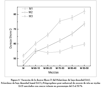 La dureza de la mezcla polipropileno pos–industrial de recorte de tela no tejida mezclado con ceniza volante es la de mayor valor, lo cual parece evidenciar una creciente interacción entre los componentes de la mezcla, y conlleva un aumento en la dureza superficial. Los polietilenos de baja densidad y lineal muestran un aumento similar en los primeros porcentajes, y posteriormente el M1 se mantiene en incremento de la resistencia, mientras el M2 genera un aumento similar al polipropileno [23].