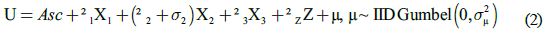 Como se ve en (2), la utilidad aleatoria ha sido descompuesta en una utilidad sistemática y en un término de error aleatorio, donde la utilidad sistemática es una función tanto de las variables observadas como de la variable latente. Igualmente, el coeficiente de X2, que en el modelo representa la diferencia en los indicadores de accidentalidad, ha sido especificado como un coeficiente aleatorio con media y desviación estándar