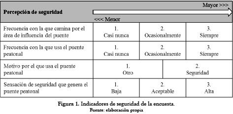 Con respecto a la sensación de seguridad generada por el puente peatonal se encontró que el 60 % de la muestra encuestada tiene una sensación de seguridad aceptable, el 24 % baja, mientras que solo el 16 % de la muestra manifestó tener una sensación de seguridad alta. Aunque no se hicieron indagaciones adicionales al respecto, es posible que la baja sensación de seguridad tenga su origen en problemas de seguridad social, entre los que se pueden citar los robos que eventualmente se presentan en los puentes peatonales.
