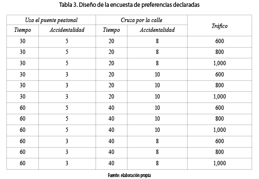 Se empleó un diseño experimental de preferencias declaradas etiquetadas para dos alternativas: usar el puente peatonal y no usarlo. Cada alternativa se caracterizó con los atributos tiempo y accidentalidad, haciendo variar el tráfico de manera genérica para dar contexto a la elección, tal como se ve en la tabla 2. La idea de haber asociado la accidentalidad en forma específica a cada alternativa fue dar a entender a los entrevistados los distintos niveles de riesgo implícitos en la decisión de usar el puente o cruzar la calle.