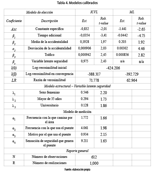 Los resultados son presentados en la tabla 4, donde se muestran los parámetros estimados para el modelo ICLV y para un modelo mixto (ML) de referencia. Los dos modelos se estimaron utilizando 1,000 extracciones para cada variable aleatoria y considerando el efecto de panel de las observaciones. La primera parte de la tabla presenta los parámetros estimados del modelo de elección; la segunda parte exhibe los parámetros del modelo estructural, y la última parte contiene los resultados del modelo de medición; al lado de cada coeficiente estimado se presenta el estadístico t–robusto. Aunque la tabla 4 no presenta los valores estimados para los umbrales, ya que a partir de ellos no se puede hacer ninguna interpretación práctica, se tuvo el cuidado de verificar su coherencia, comprobando para los indicadores de tres categorías que