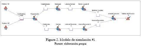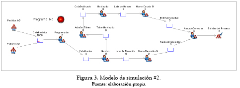 Con el objeto de validar los alcances de la metodología Kanban propuesta, se desarrollaron dos modelos de simulación mediante el software SIMUL8. En el primer modelo, como se observa en la figura 2, se muestra la forma como operan actualmente las líneas de fabricación de bobinado, núcleo y su punto de encuentro para la entrega posterior a la línea de ensamble, armado y conexión. El segundo modelo (figura 3) muestra la misma configuración pero con la implementación de la metodología Kanban propuesta. Posteriormente se evaluarán las salidas del modelo número 1 (Actual) frente a modelo número 2 (Actual + Kanban) y se valora el desempeño de la metodología. En el modelo número 2, no se modifica ningún parámetro de tasa de producción ni se efectúan cambios sobre las capacidades de producción de los centros de trabajo. El cambio en el modelo número 2 respecto al modelo número 1 solo obedece a la metodología Kanban propuesta, la cual solo incide en la forma como se programa la producción. Las tasas de producción empleadas son supuestas con el objetivo de preservar la privacidad de la empresa en la cual se realizó la investigación aplicada.